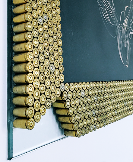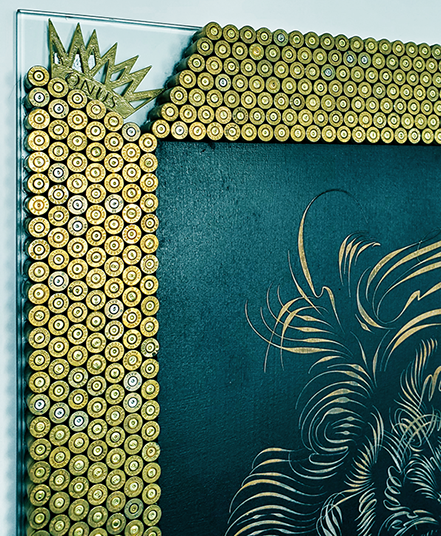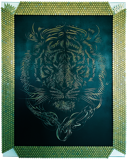 Caligraphiti Hand-Engraved Supreme Tiger in solid wood by artist Medeio (Rei Misiri), with a tempered glass frame made with 1700 pieces of hand-placed upcycled bullet shell cartridges.