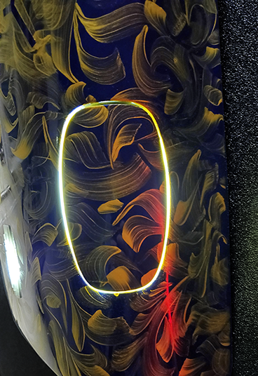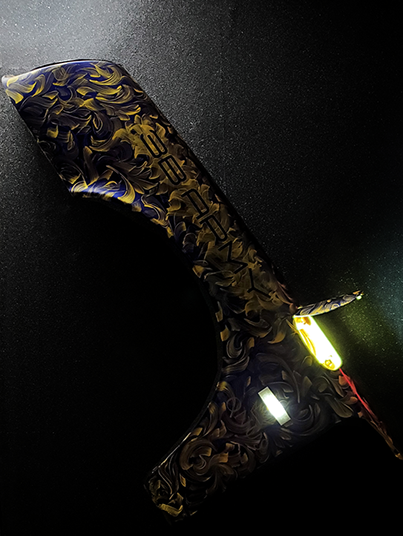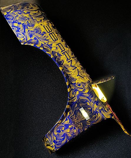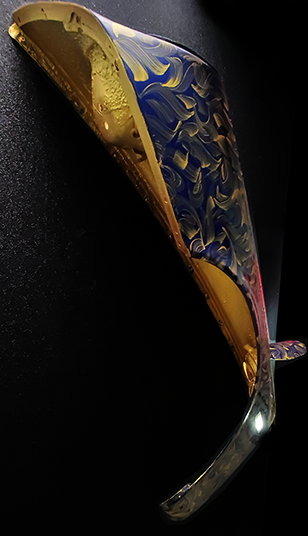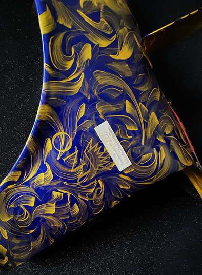 Genuine blue original upcycled Porsche 911 Carrera RS 1974 part, hand-painted by artist Medeio (Rei Misiri) in gold art, transformed into an interior mural light for your home or studio.
