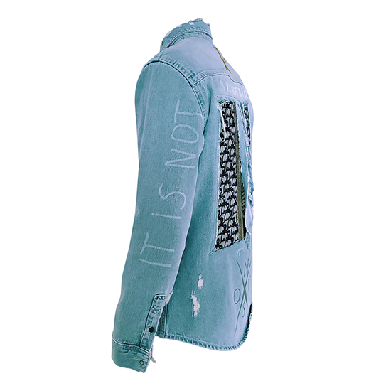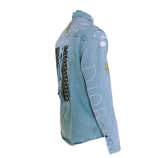 Vintage Denim Shirt. Repurposed fabric from Dior bag. Custom Patches & Paint. 3D printed & hand crafted sustainable details.