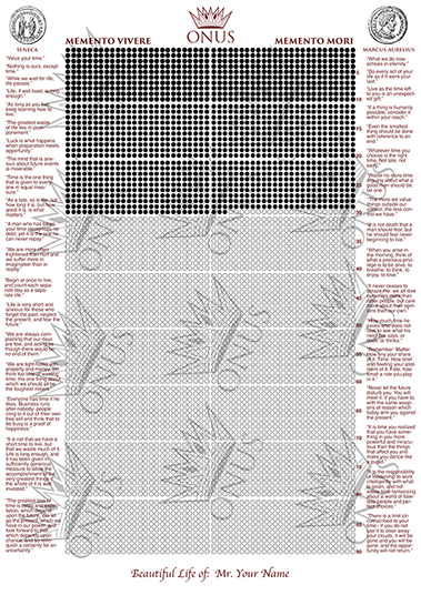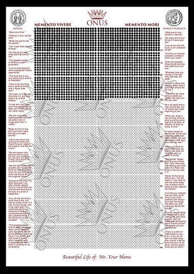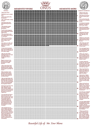 Order your custom personalized limited edition Memento Vivere / Memento Mori with your exact time span, by sending us your birthday. Increase your awareness of time in style with the ONUS Memento Vivere / Memento Mori. It comes with the best most important quotes of stoics Marcus Aurelius and Seneca.