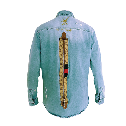 Vintage Denim Shirt. Repurposed fabric & leather from Gucci bag. Custom Patches & Paint. 3D printed & hand crafted sustainable details.
