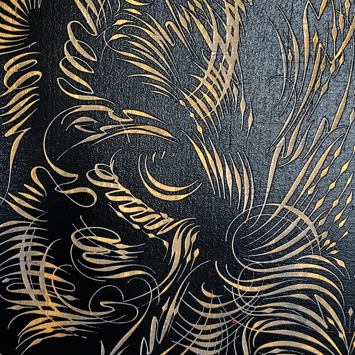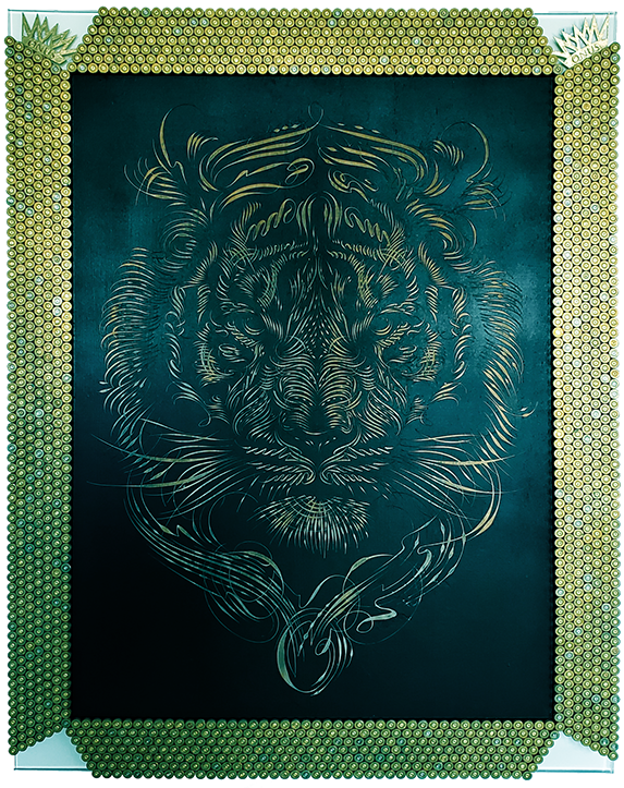 Caligraphiti Hand-Engraved Supreme Tiger in solid wood by artist Medeio (Rei Misiri), with a tempered glass frame made with 1700 pieces of hand-placed upcycled bullet shell cartridges.