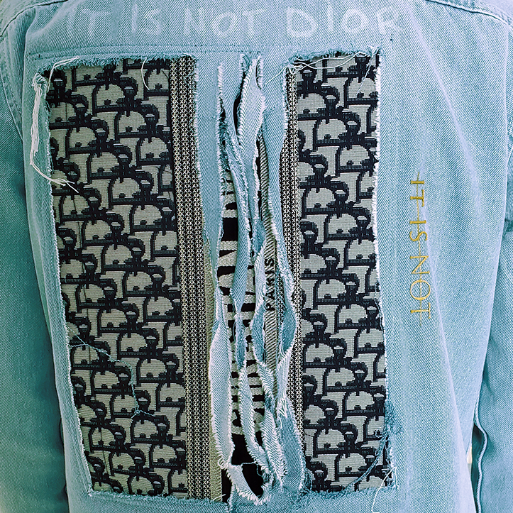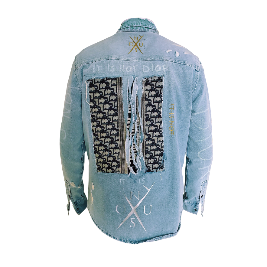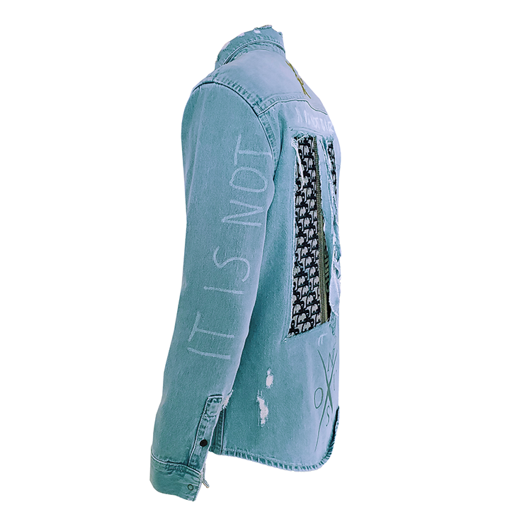 Vintage Denim Shirt. Repurposed fabric from Dior bag. Custom Patches & Paint. 3D printed & hand crafted sustainable details.