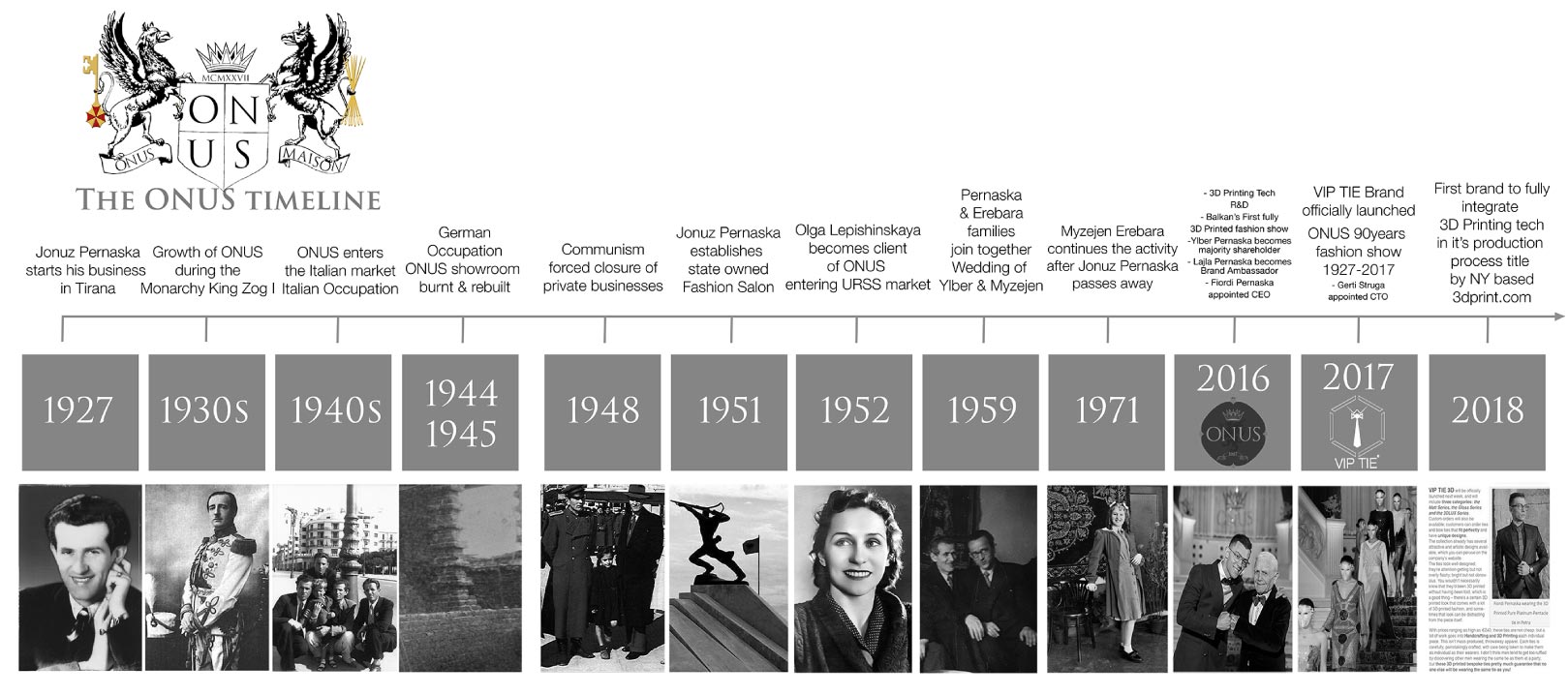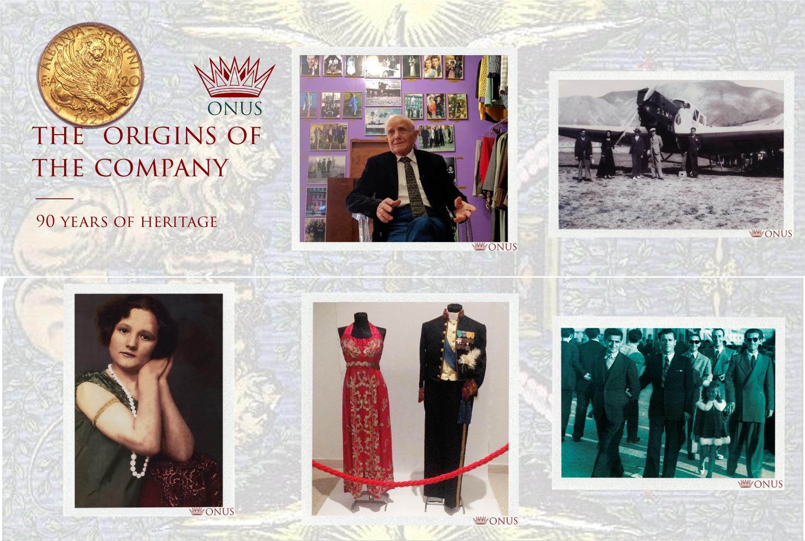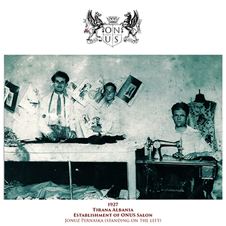 In 1927, fashion designer Jonuz Pernaska, established ONUS Maison in Tirana for the design and creation of high fashion clothing using the finest fabrics. He was an innovative and creative fashion designer who traveled across Europe for the purchase of the finest raw materials, making the final creations more of an art. The retailers of the salon were located mainly in Italy (Milan/Florence), France (Paris) & England (London).