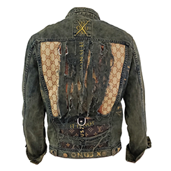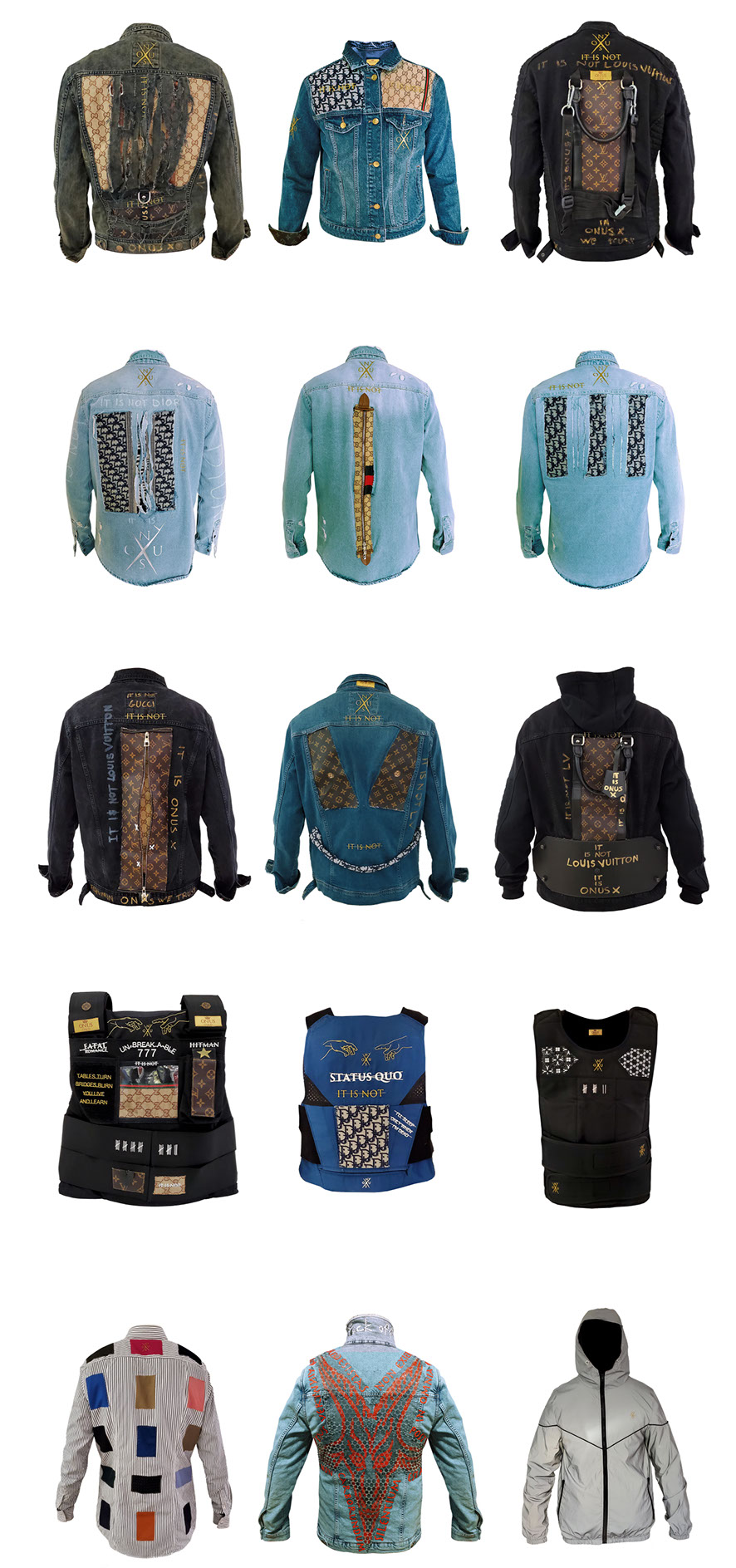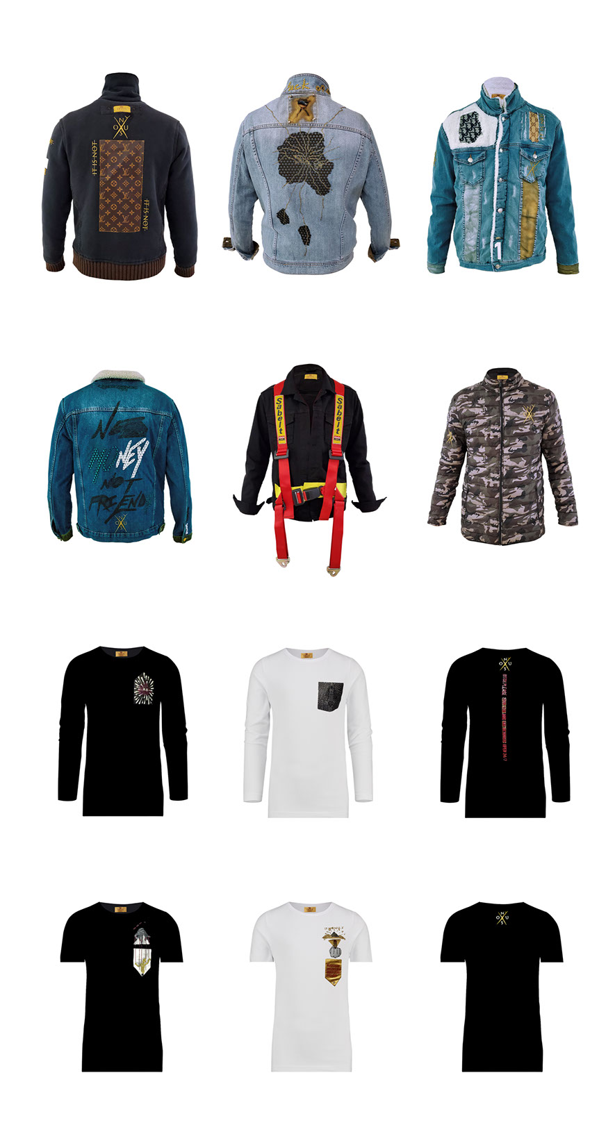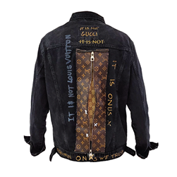 Our pieces are made from the combination of several pieces of clothing repurposed to be used as a canvas. We only represent our namesake brand and our official collaborators which are always officially announced. We are not affiliated with, or endorsed by any other brand name or logo you may see on our clothing.