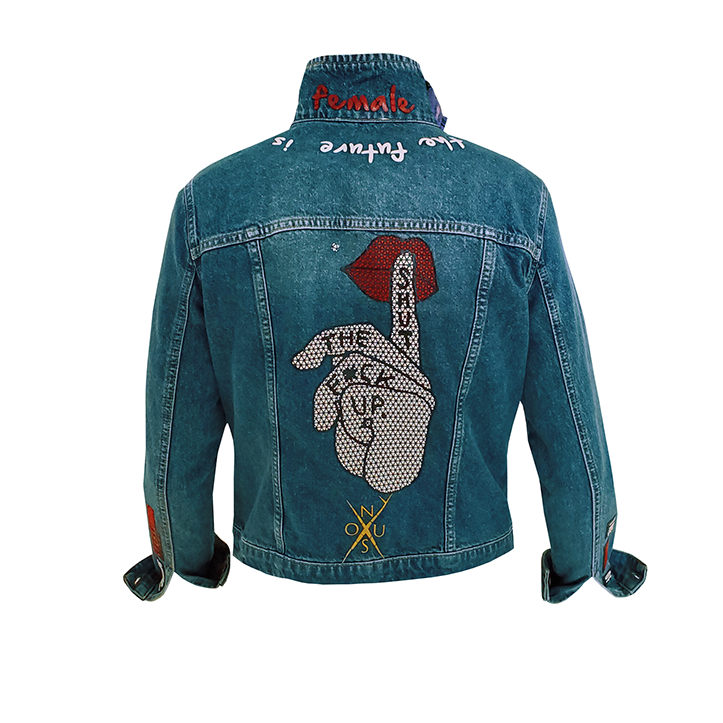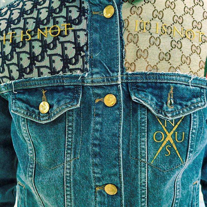Vintage Denim Jacket. Repurposed fabric from Dior bag. Repurposed fabric Gucci bag, Custom Patches & Paint. 3D printed & hand crafted sustainable details.