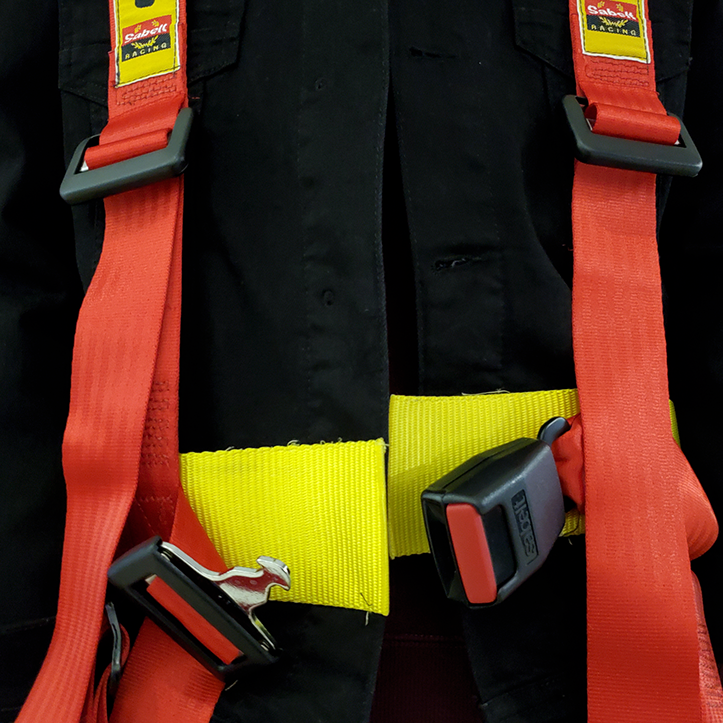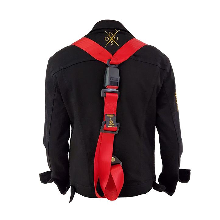 Vintage Denim Jacket. Repurposed Sabelt 4-harness seatbelts from race car. 3D printed & hand crafted sustainable details.