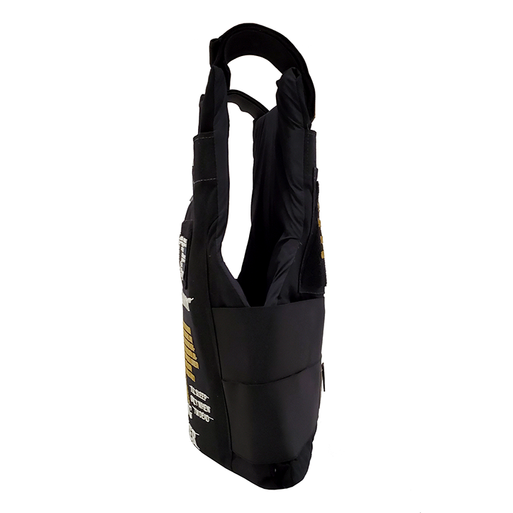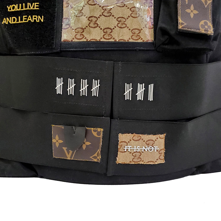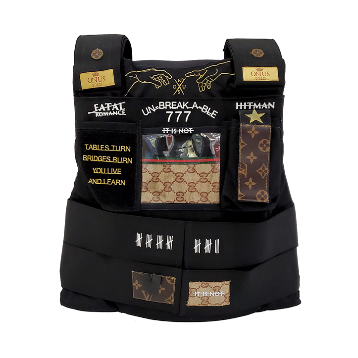 Repurposed SWAT bulletproof & sniperproof Kevlar heavy duty vest. Repurposed fabric & leather from Gucci bag. Repurposed leather from Louis Vuitton bag. Custom Patches & Paint in canvas and leather. 3D printed & hand crafted sustainable details.