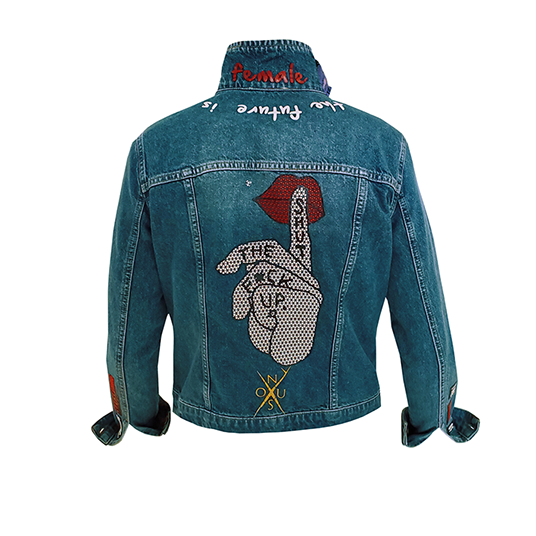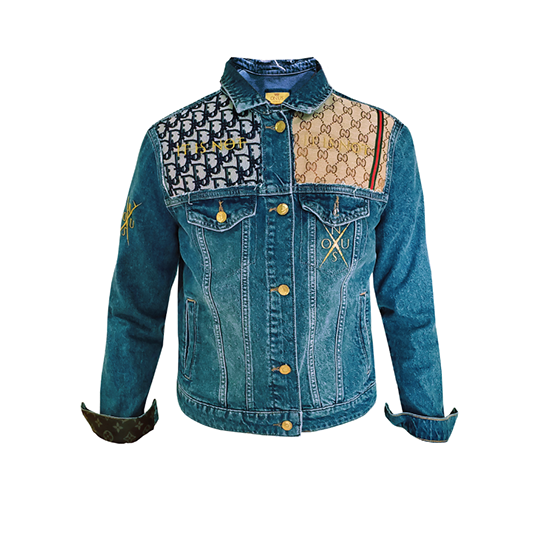 Vintage Denim Jacket. Repurposed fabric from Dior bag. Repurposed fabric Gucci bag, Custom Patches & Paint. 3D printed & hand crafted sustainable details.