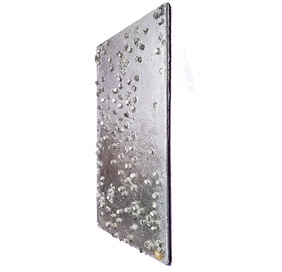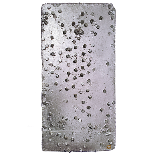 Hand-made concrete art with upcycled sustainable 3D-printed plastics in relief.
